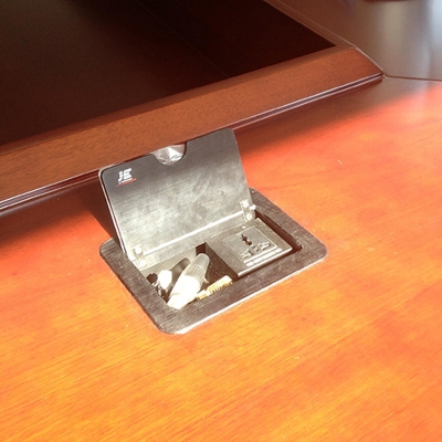 JS-4系列可藏式接線盒提供了一個整潔、緊湊、簡單的鏈接解決方案。4系列接線盒使用時只需掀起內面板,隱藏在內的線纜展露出來,抽拉出線纜連接號誰被后即可使用,使用完畢后把線纜放回盒內,閉合面板,各種接口隱藏起來,隱藏后的接線盒與平臺保持水平。